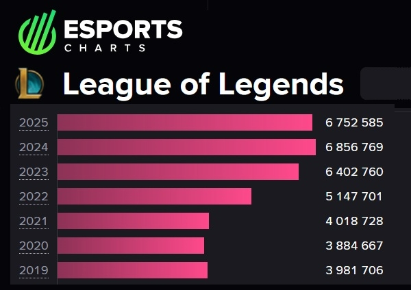 e스포츠 시청자 수 통계는 약간 차이가 있다. 유럽 뉴미디어 통계 분석 플랫폼 e스포츠 차트가 집계한 LOL 월드 챔피언십, 이른바 '롤드컵'의 최다 동시 시청자 수는 2024년에 685만 명으로 정점을 찍었다. 2023년은 640만 명, 2022년은 514만 명, 2021년 401만 명, 2020년 388만 명 순으로 점점 증가했다. 올해에는 675만 명으로 전년 대비 조금 주춤한 모양새로 실제 이용자 수보다 늦게 감소세가 시작된 모양새다.