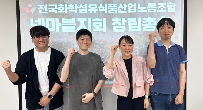 전국민주노동조합총연맹 전국화학섬유식품산업노동조합(화섬식품노조) 산하 넷마블지회, 이른바 넷마블 노조가 7일 공식 출범했다. 왼쪽부터 넷마블 지회의 이상윤 사무장, 이정헌 부지회장, 이해미 지회장, 이정훈 수석부지회장. 사진=화섬식품노조 넷마블지회이미지 확대보기