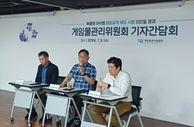 김규철 게임물관리위원장(가운데)이 7월 3일 열린 기자간담회에서 질의에 답변하고 있다. 사진=이원용 기자