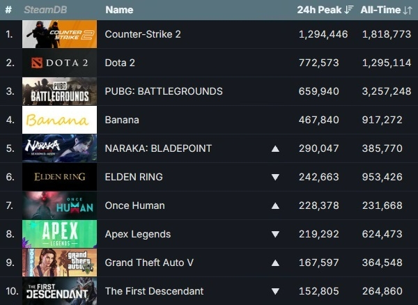 이미지 확대보기7월 21일 기준 스팀 게임들의 최다 동시 접속자 순위. 화살표는 14일 대비 순위 변동을 표시한 것. 사진=스팀 데이터베이스