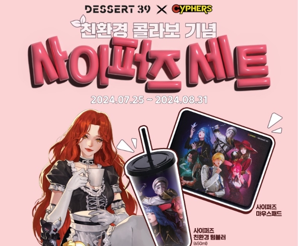 이번 제휴 이벤트로 국내 디저트39 매장에서 사이퍼즈 테마 식음료, 그랑플람과 협력 제작된 텀블러, 마우스패드 굿즈 등이 한정 상품으로 판매된다. 기간은 오는 8월 31일까지 약 5주다.