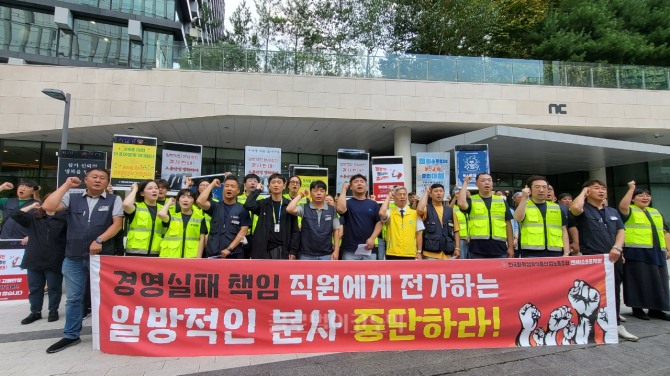 전국화학섬유식품산업노동조합 엔씨소프트지회(이하 엔씨 노조)가 26일 엔씨소프트 본사 사옥 앞에서 일방적 분사 반대와 고용 안정 쟁취를 위한 기자회견을 가졌다. 이날 기자회견 발언에 나선 박영준 화섬식품노조 수도권지부 지부장은 엔씨소프트 경영진을 향한 비판의 목소리를 높였다.