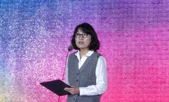 김민정 렐루게임즈 대표가 2024 대한민국 게임대상 스타트업 기업상 수상자로 나서 수상 소감을 말하고 있다. 사진=편슬기 기자이미지 확대보기