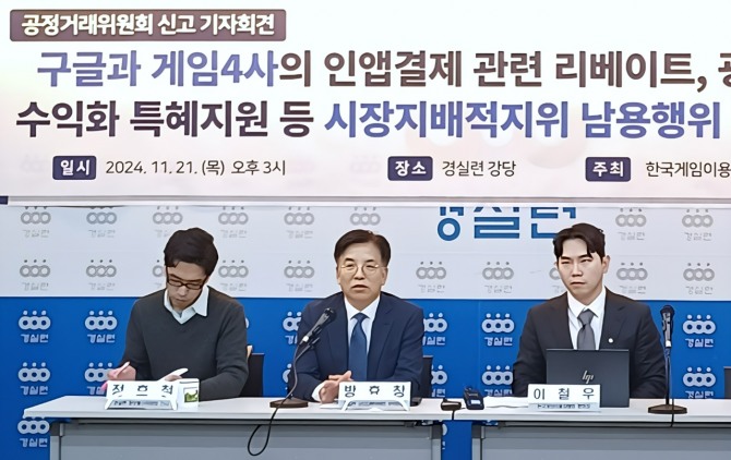 경제정의실천시민연합(경실련)과 한국게임소비자협회, 한국게임이용자협회는 21일 서울 종로구 혜화 소재 경실련회관에서 '구글 게임사 인앱결제 관련 시장지배적지위 남용행위 등 공정위 신고' 공동 기자회견을 열었다.