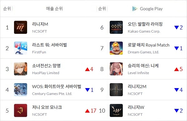 엔씨소프트(NC)의 '리니지M', 중국 퍼스트펀 '라스트 워: 서바이벌'이 투 톱을 지킨 가운데 중국 미카팀의 미소녀 수집형 RPG '소녀전선2: 망명'과 방치형 RPG '저니 오브 모나크' 등 두 신작이 매출 톱5에 올랐다.