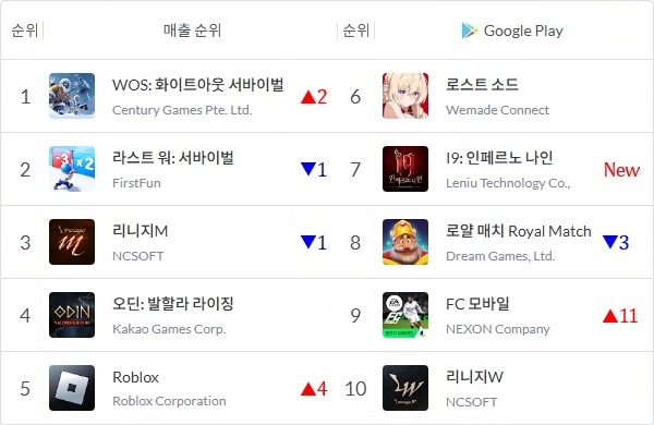 중국 센추리 게임즈의 'WOS: 화이트아웃 서바이벌'이 국내 구글 플레이스토어 게임 매출 1위에 올라섰다.