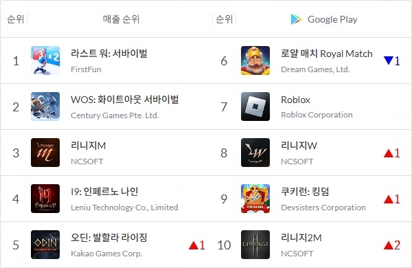 앱 통계 분석 플랫폼 모바일인덱스에 따르면 중국의 '라스트 워: 서바이벌', 'WOS: 화이트아웃 서바이벌'과 '인페르노 나인', 한국 엔씨소프트의 '리니지M' 등이 한 주 동안 톱4 자리를 그대로 유지했다.