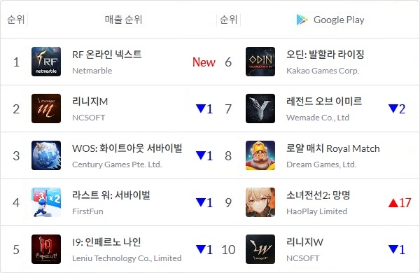 RF 온라인 넥스트의 흥행으로 최상위권 게임 상당수가 소폭 하락세를 보인 가운데 외산 서브컬처 게임 '소녀전선 2: 망명'이 톱10에 올랐다. 소녀전선 2에는 원작의 인기 캐릭터 'HK416'과 동일 캐릭터인 '클루카이'가 20일 업데이트됐다.