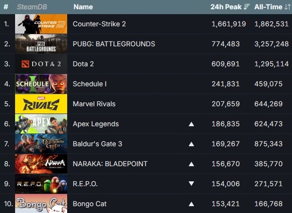 발더스 게이트 3와 봉고 캣 외에도 '나라카: 블레이드 포인트'가 톱10에 진입했다. 지난주 이용자 수 톱10이었던 '몬스터 헌터 와일즈(14만660명, 이하 20일 기준 최다 동시 접속자 수)와 '패스 오브 엑자일 2(11만1630명)', '러스트(13만2947명)'은 각각 12위, 17위, 14위에 자리 잡았으며 11위는 '라스트 에포크(14만5929명)', 13위는 베타 테스트 중인 축구 게임 '리매치(13만838명)'가 차지했다.