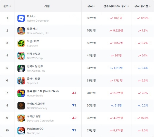 로블록스는 WAU 1위 외에도 같은 주 매출 5위 또한 기록했다. 넥슨 '마비노기 모바일'은 그보다 높은 3위를 기록한 가운데 '로얄 매치'가 11위, '브롤스타즈'가 21위, '쿠키런: 킹덤'이 36위에 자리 잡았다.