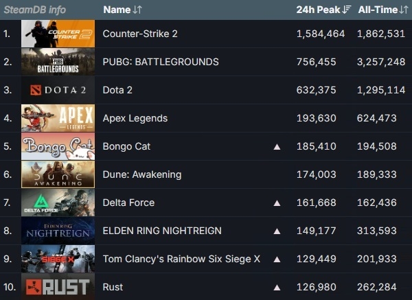 이미지 확대보기2025년 6월 22일 기준 스팀 게임들의 최다 동시 접속자 순위. 화살표는 15일 대비 순위 변동을 나타낸 것. 사진=스팀 데이터베이스