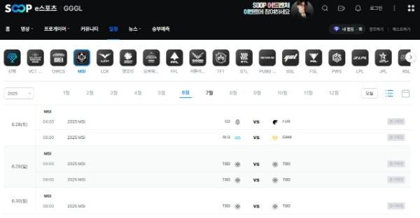 SOOP e스포츠 공식 채널의 미드 시즌 인비테이셔널(MSI) 2025 경기 일정을 캡처한 것. 사진=SOOP이미지 확대보기