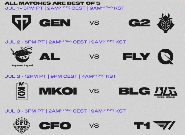 이어 3일에는 중국 LPL 1시드 애니원즈 레전드(AL)가 북미 LTA 1시드 플라이퀘스트(FLY)와 겨룬다. 4일에는 LEC 1시드 모비스타 코이(MKOI)와 VLG가, 5일에는 LCP 1시드인 대만 중신은행 플라잉 오이스터(CFO)가 LCK 2시드 T1과 대결을 펼칠 예정이다.