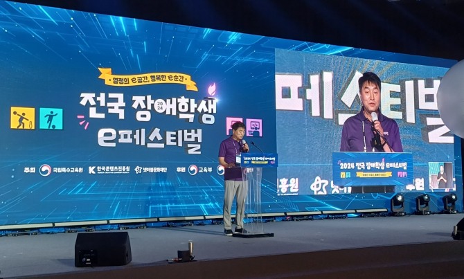 이미지 확대보기서울 서초 더케이호텔 서울에서 열린 2024년 9월 3일 열린 '전국 장애학생 e페스티벌' 개막식 현장의 모습. 김성철 넷마블문화재단 대표가 기념사를 하고 있다. 사진=이원용 기자