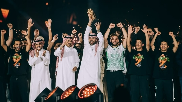 이미지 확대보기사우디아라비아 팀 팔콘스 관계자들이 EWC 2025 클럽 챔피언십 우승 확정 후 트로피 세리머니를 하고 있다. 사진=EWC 재단