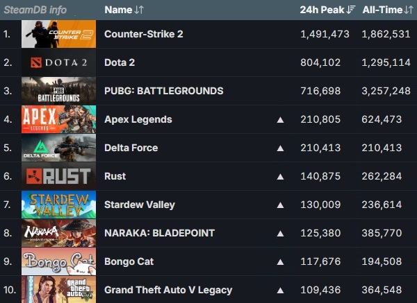 이미지 확대보기2025년 8월 24일 기준 스팀 게임들의 최다 동시 접속자 순위. 화살표는 17일 대비 순위 변동을 나타낸 것. 사진=스팀 데이터베이스