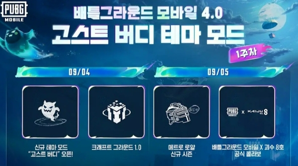 배그 모바일에는 컬래버레이션 이벤트 외에도 헬러윈 테마 모드 '고스트 버디', 비대칭 생존 경쟁 모드 '숨바꼭질' 등이 업데이트된다.