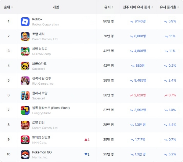 같은 주 로블록스 외 매출 톱5 게임들의 WAU와 전주 대비 변화율은 △1위 센추리 게임즈 'WOS: 화이트아웃 서바이벌' 12만3135명(+0.03%) △2위 엔씨소프트 '리니지M' 10만3639명(+10.88%) △3위 펀플라이 '라스트 워: 서바이벌' 13만9652명(-0.20%) △5위 뱀피르 11만9026명(-35.15%) 등으로 집계됐다.