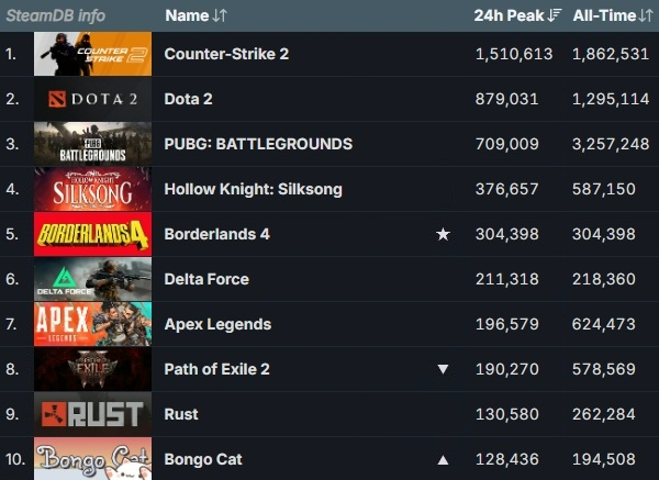 9월 2주차 이용자 수 상승을 이끈 것은 9월 4일 출시된 신작 '할로우 나이트: 실크 송'과 12일 신작 '보더랜드 4'다. '실크 송'은 지난주에 이어 이번주까지 2주 연속 동시 접속 4위를 기록했다. 이번주 새로이 차트에 오른 보더랜드 4는 동시 접속자 수 30만4398명으로 5위에 자리 잡았다.