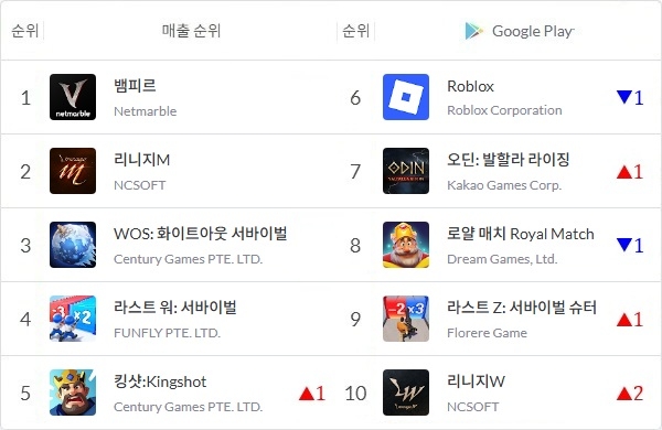엔씨소프트 '리니지M'과 중국 온라인 전략 게임 'WOS: 화이트아웃 서바이벌', '라스트 워: 서바이벌'까지 톱4가 한 주 동안 제 자리를 지킨 가운데 'WOS' 개발사 센추리 게임즈의 '킹샷'이 매출 5위까지 치고 올라왔다.