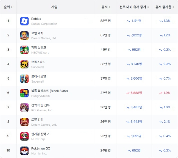 아이지에이웍스 앱 통계 분석 플랫폼 모바일인덱스의 9월 4주차(22일~28일) 자료에 따르면 3주차에 비해 WAU 1위 '로블록스'부터 10위 '포켓몬 고'까지 10개 게임 간 순위 변동이 없었다.