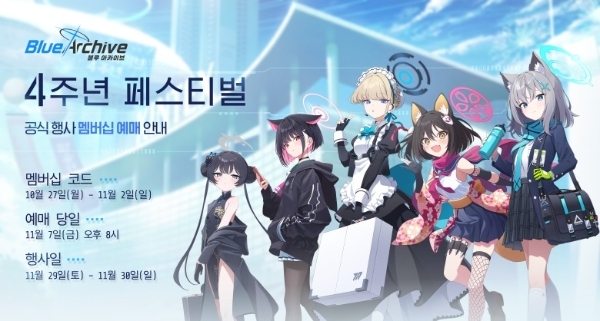 블루 아카이브 운영진은 공식 커뮤니티를 통해 27일 '블루 아카이브 4주년 페스티벌' 예매를 위한 멤버십 코드를 발행한다고 발표했다.