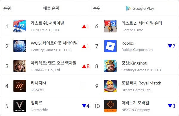 중국산 온라인 전략 게임 '라스트 워: 서바이벌'과 'WOS: 화이트아웃 서바이벌'이 매출 투 톱으로 올라섰다. 지난주 1위였던 넷마블 MMORPG '뱀피르'는 5위로 자리를 옮겼다.