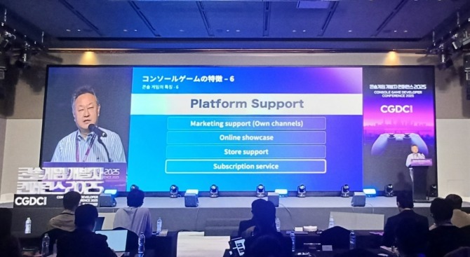 더블트리 바이 힐튼 서울 판교에서 11월 6일 '콘솔게임 개발자 컨퍼런스(CGDC) 2025'가 열렸다. 요시다 슈헤이 전 소니 인터래티브 엔터테인먼트(소니IE) 이사가 콘솔 게임만의 특징에 대한 기조 연설을 하고 있다. 사진=이원용 기자이미지 확대보기