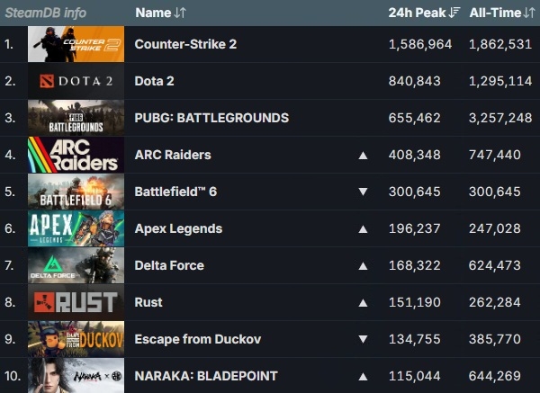 국산 게임 중 3위 크래프톤 '펍지: 배틀그라운드'와 4위 아크 레이더스 외 주요 게임들의 순위를 살펴보면 프로젝트 문 '림버스 컴퍼니(4만2870명)'가 44위, 펄어비스 '검은사막(2만839명)'이 101위에 자리 잡았다.
