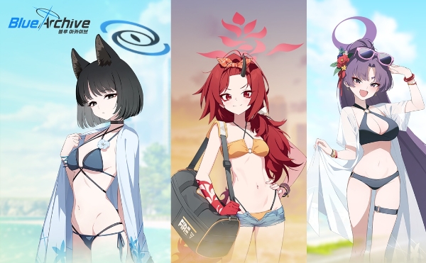 이미지 확대보기블루 아카이브에 추가되는 신규 캐릭터들. 왼쪽부터 '키쿄(수영복)', '렌게(수영복)', '유카리(수영복)'. 사진=넥슨게임즈