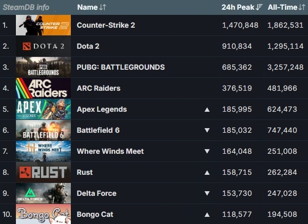 2025년 12월 7일 기준 스팀 게임들의 최다 동시 접속자 순위, 화살표는 11월 30일 대비 순위 변동을 나타낸 것. 사진=스팀 데이터베이스