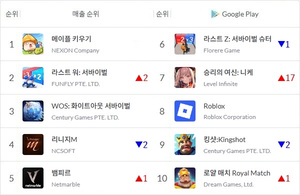 메이플 키우기 외에도 시프트업의 '승리의 여신: 니케'가 지난 4일 크리스마스 테마 업데이트를 적용한 데 힘입어 구글 매출 7위까지 다시 치고 올라왔다. 지난주 11위 '로얄 매치'도 10위에 복귀했다.