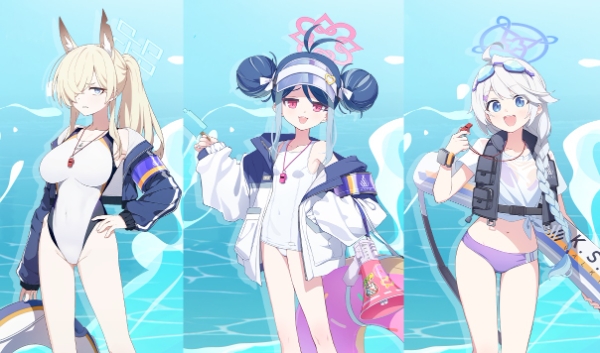 '칸나(수영복)'와 '후부키(수영복)'는 픽업 모집(확률 뽑기)로 얻을 수 있는 3성 스트라이커 캐릭터다. 칸나(수영복)은 적 1인에게 강력한 방어력 감소 디버프를 부여하고 아군 스페셜 학생의 공격력을 강화하는 지원형 캐릭터로, 후부키(수영복)은 넓은 범위에 걸쳐 보호막을 무시하는 피해를 입히는 독특한 폭발 타입 데미지 딜러로 디자인됐다.