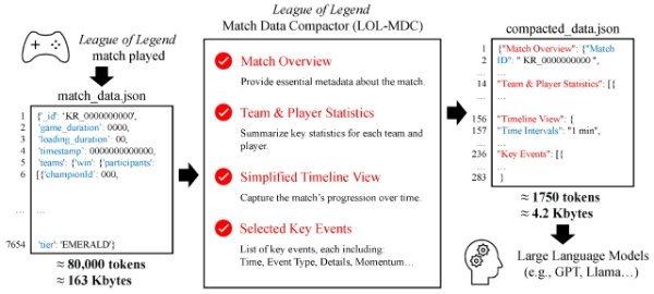 이미지 확대보기'대규모 언어 모델 입력용으로 구조화, 요약한 LOL 매치 데이터' 논문의 주요 내용을 요약한 파이프라인 이미지 자료. 사진=다학제 디지털출판연구소(MDPI)