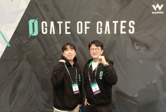 이미지 확대보기지스타 2025 '게이트 오브 게이츠' 미디어 그룹 인터뷰에서 리트레일의 정명근 아트 디렉터(왼쪽)와 박찬혁 기획팀장이 기념 촬영을 하고 있다. 사진=이원용 기자