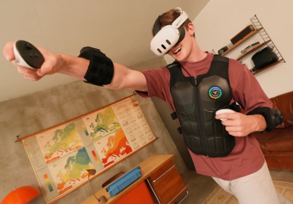 비햅틱스의 신제품 '택수트 프로'와 '택슬리브'를 VR 헤드셋과 함께 착용한 예시 이미지. 사진=비햅틱스이미지 확대보기