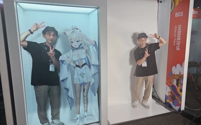 아테크넷은 현장에서 등신대 홀로그램 기기 '메타그램'을 선보였다. 버추얼 아바타와 실제 인간이 함께 사진을 찍을 수 있는 형태로 크리에이터버스의 대표 버튜버 '이주인' 등과 함께 사진을 찍을 수 있는 체험 공간이 마련됐다.