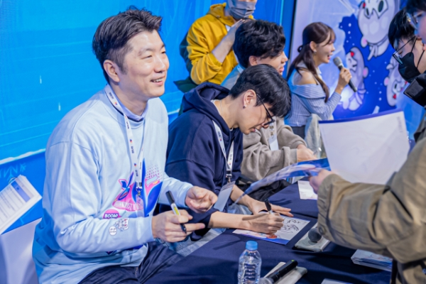 이미지 확대보기AGF 2025 부스에서 열린 개발진 사인회 현장의 모습. 왼쪽부터 김종호 네오위즈 사업부장, 겜프스엔의 이준희 브더2 총괄 PD와 '색종이' 한성 메인 원화 팀장. 사진=네오위즈