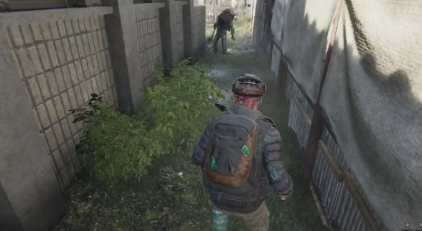 좁은 골목에서 중무장하고 큰 삽을 든 특수 좀비 '게더러'를 마주쳤다. 사진=낙원 알파 테스트 버전 캡처이미지 확대보기