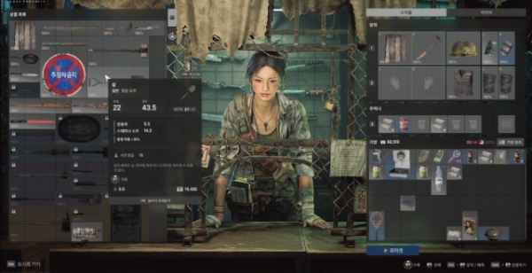 낙원 인게임에선 다양한 외형을 가진 상점 주인 NPC들을 만날 수 있다. 표지판을 뜯어내 만들었다는 콘셉트의 방패 또한 눈에 띈다. 사진=낙원 알파 테스트 버전 캡처이미지 확대보기