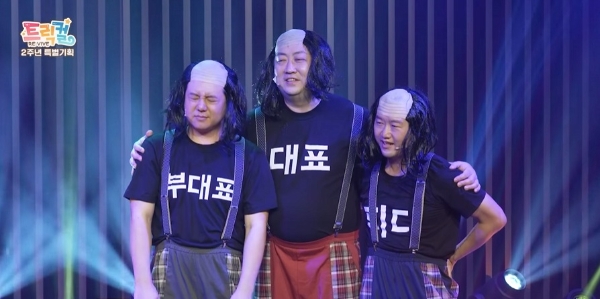 이미지 확대보기트릭컬 리바이브 2주년 기념 방송 중 '마빡이' 패러디 코너를 선보인 에피드게임즈 경영진들. 왼쪽부터 심정선 부대표와 한정현 대표, 이현승 트릭컬 리바이브 총괄 PD. 사진=에피드게임즈