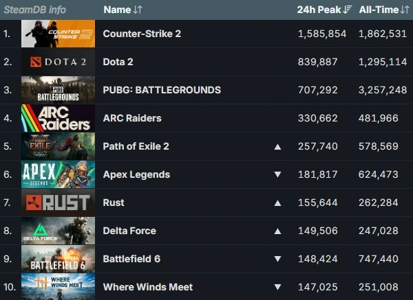 PoE 2 위로 스팀 운영사 밸브 코퍼레이션의 '카운터 스트라이크 2'와 '도타 2', 한국 게임인 크래프톤 '펍지: 배틀그라운드'와 넥슨 '아크 레이더스' 등 네 게임은 제 자리를 지켰다. 특히 아크 레이더스는 출시 후 6주 연속 4위를 지키고 있다.