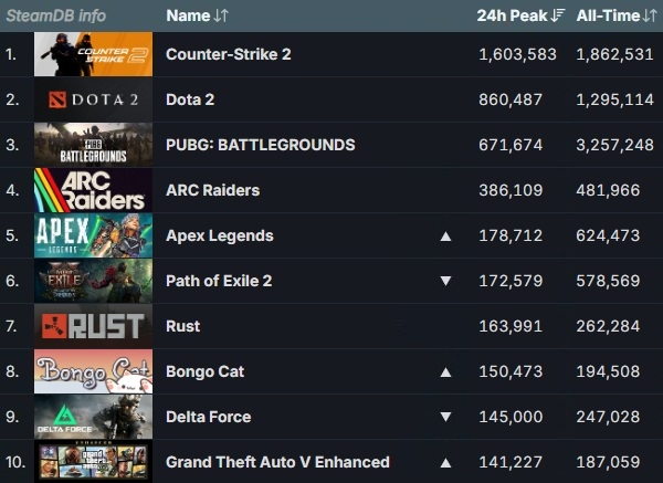 '봉고 캣'과 '그랜드 테프트 오토(GTA) 5' 인핸스드 버전이 이번주 새로이 톱10에 올랐다. 지난주 9위 '배틀필드 6(12만9124명, 21일 기준 최다 동시 접속자 수)'와 10위 '연운(11만6451명)'은 이번주 각각 12위, 16위를 기록했으며 11위는 'GTA 5' 레거시 버전(13만6992명)이 차지했다.