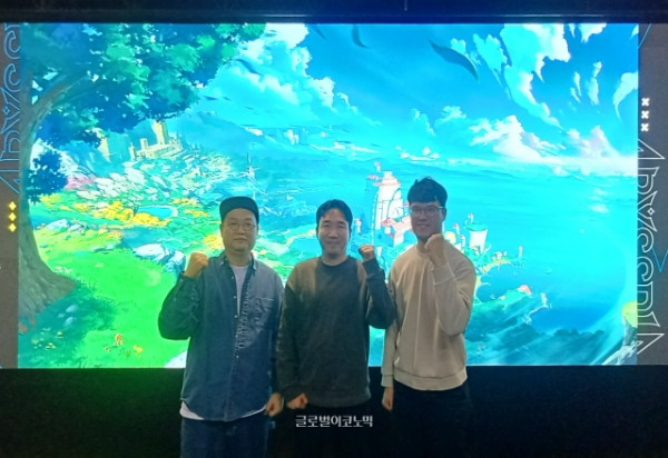 이미지 확대보기NHN이 2월 10일 판교 사옥에서 어비스디아 미디어 간담회를 열었다. 왼쪽부터 정중재 NHN 사업실장과 링게임즈의 김원주 PD, 김태헌 개발사업실장. 사진=이원용 기자