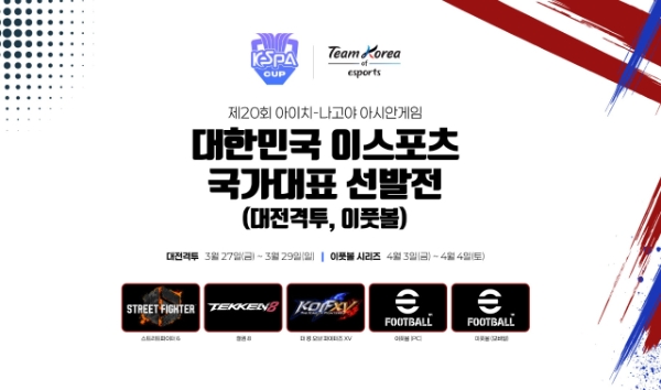 한국e스포츠협회(KeSPA)가 오는 9월 개최를 앞둔 2026 아이치·나고야 아시안 게임에 e스포츠 종목 중 대전 격투 게임 3종 종목과 'e풋볼' 시리즈의 국가대표 선발전을 연다고 19일 밝혔다.