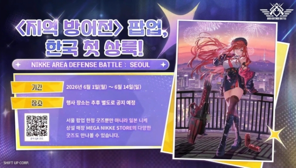 이번 서울 지역 방어전은 6월 1일부터 14일까지 2주 동안 열린다. 장소는 추후에 공개되며 서울 팝업 한정 굿즈는 국내는 물론 일본 '메가니케 숍'에서 판매되는 굿즈들이 국내 게이머들에게도 공개될 예정이다.