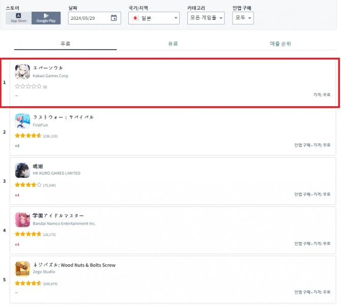 앱 통계 분석 플랫폼 센서타워에 따르면 29일 오전 11시 20분경, 에버소울은 구글 플레이 무료 다운로드 1위를 기록 중이다. 5월 글로벌 기대작으로 꼽혔던 '명조: 워더링 웨이브'가 3위, 반다이남코의 엔터테인먼트 육성 시뮬레이션 게임 '학원 아이돌 마스터'가 4위를 기록 중이다.