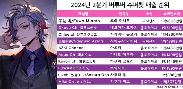 2024년 2분기 버추얼 유튜버 슈퍼챗 매출 순위. 이미지는 '후와 미나토'. 사진=니지산지, 표=이원용 기자이미지 확대보기
