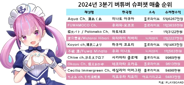 이미지 확대보기2024년 3분기 글로벌 버추얼 유튜버(버튜버)들의 유튜브 슈퍼챗 매출 순위. 이미지는 1위를 차지한 전 홀로라이브 멤버 '미나토 아쿠아'. 사진=홀로라이브 프로덕션, 표=이원용 기자