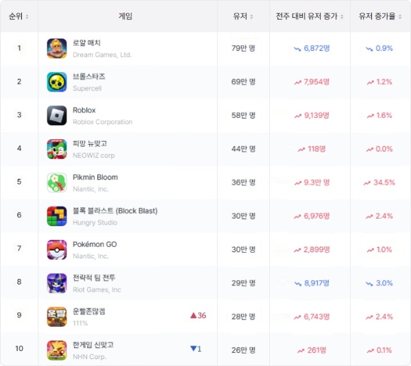 드림 게임즈 '로얄 매치'와 슈퍼셀 '브롤스타즈', 로블록스 코퍼레이션 '로블록스', 네오위즈 '피망 뉴맞고' 등 WAU 톱4의 순위에는 변동이 없었다. 지난주 5위에 올랐던 '전략적 팀 전투(TFT)'는 이번주 8위에 자리 잡았다.